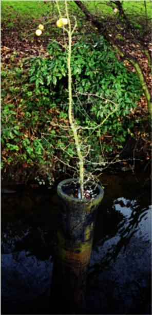 Having wrestled with my conscience all year over the disposal of apple cores, (see link) today at Guildford my mind was put at ease. It seems I'm not the only one who has searched suitable receptacles for apple cores. By the bridge over the River Wey, just at the foot of the High Street, we found this apple tree with three or so apples holding on tenaciously to the wintry branches. The amazing thing was that it was growing in a pylon in the river. Someone had been a pretty mean short with their apply core, and an apple tree was born.