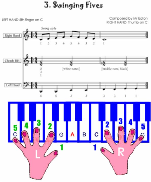 In this Swinging Fives exercise, you start with your RH thumb on C, as in the previous Flexing Fives examples, and skip up and down the five steps and then rest on the C.